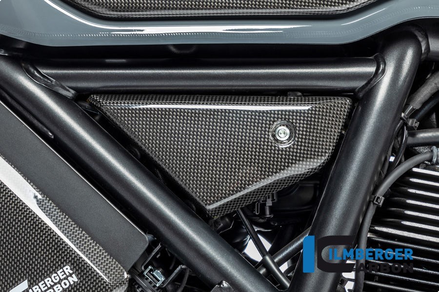 Die Abdeckung unterm Rahmen für die linke Seite in Carbon und glänzender Ausführung für die Ducati Scrambler 1100 ab 2017 wird an vorhandenen Haltepunkten am Fahrzeug aufgeschraubt.