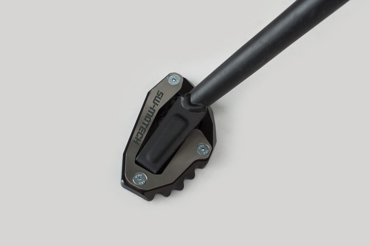 Die formschöne Fussverbreiterung ist aus hochfester Aluminium-Legierung CNC-gefrässt. Dank der grosszügigen Auflagefläche wird ein Versinken auf weichem Untergrund verhindert. Der Verbreiterungsfuss ist silber eloxiert, das obere Anbaublech schwarz pulverbeschichtet.