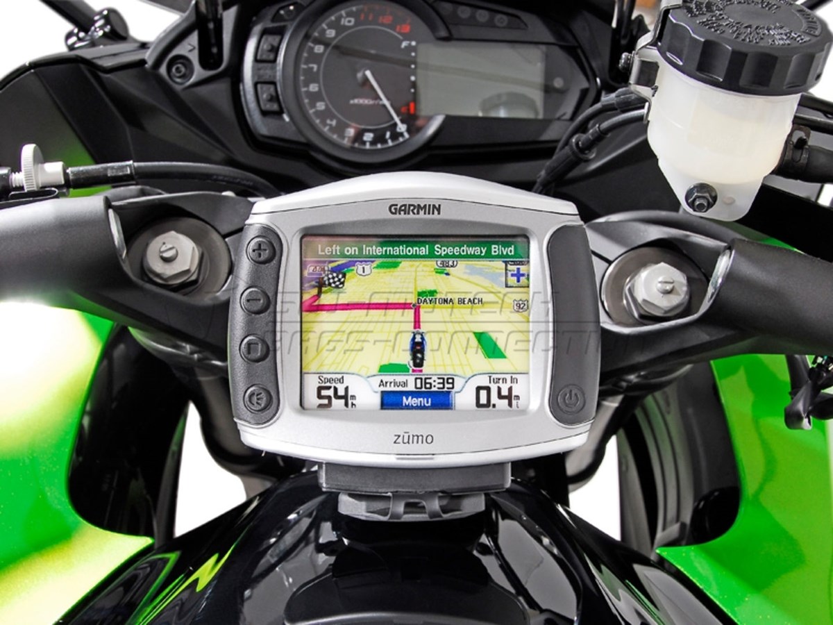 Abnehmbare GPS-Halterung für sorgenfreies Pausieren. Der GPS-Halter und das GPS-Gerät lassen sich in sekundenschnelle ab- und anmontieren. Vibrations- und Stossübertragungen werden weiterhin reduziert.