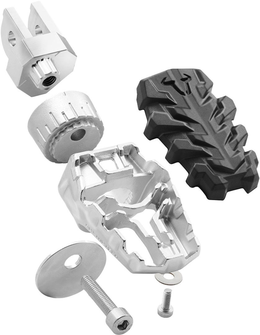 La position n'est pas confortable avec le repose-pied d'origine ? Nous proposons alors la solution idéale : le kit de repose-pieds EVO de SW-MOTECH. Un système ingénieux, composé d?éléments rotatifs à dents fixes qui s'emboîtent, permet 36 possibilités différentes. Le repose-pieds peut être réglé vers l'arrière, l'avant et le bas, et aussi incliné selon les besoins de chaque pilote. Les adaptateurs articulés se montent simplement avec les pièces d'origine sur les supports de repose-pieds. Une notice d'installation explique comment ça marche.