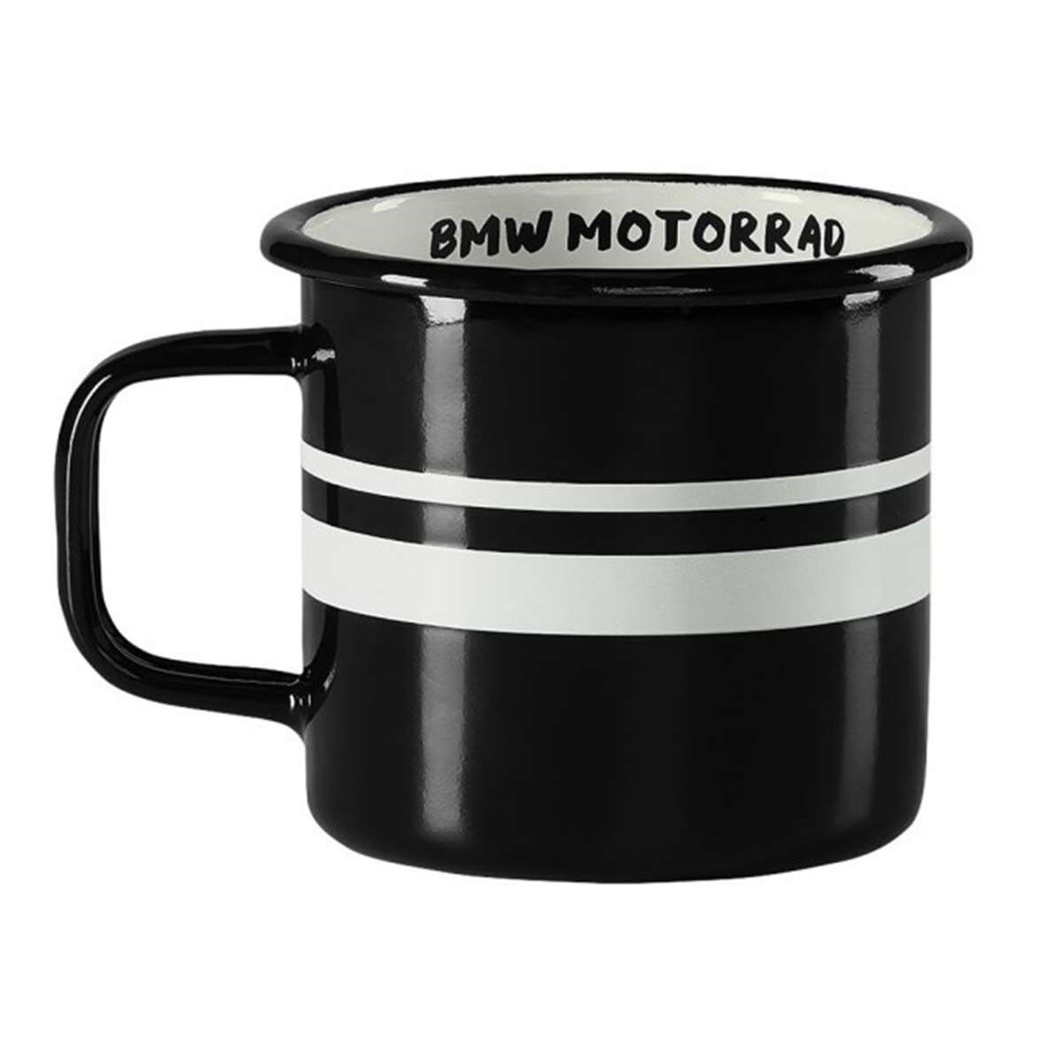 Emaille-Tasse mit Schriftzug und gedrucktem BMW Motorrad Logo.