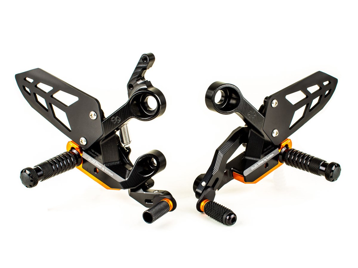 Komfortabel verstellbare Fußrastenanlage Hochfestes Aluminium AL7075 Perfekte Kombination: geringes Gewicht und Stabilität. Sowohl Normal- als auch Schaltumkehrung möglich. Beidseitiger Alufersenschützer. Vielfältige Einstellmöglichkeiten: Fußraste, Schaltweg, Trittlänge Präzise Positionierung durch präzisen Verstellschieber Schalt-/ Bremshebel: spielfrei doppelt kugelgelagert. Starre Racing-Rasten (Abbildungen zeigen teilweise optionale Klapprasten). Diese Fussrastenanlage benötigt für eine legale Nutzung im öffentlichen Straßenverkehr, zusätzlich noch klappbare Rasten.