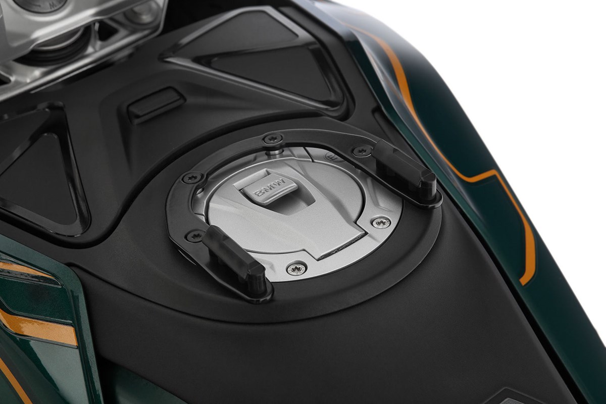 Der modellspezifische, sogenannte Tankring bildet die solide Basis zur sicheren, mechanischen Arretierung der CLICK BAG Tankrucksäcke. Zum Befestigen wird der CLICK BAG von oben in die beiden Führungen des Tankrings eingesetzt, bis das Schloss automatisch verriegelt. Mit einem Riemen am Tankrucksack lässt sich die Arretierung mit einem Zug lösen. So kann der Tankrucksack im Handumdrehen - zum Beispiel zum Tanken – abgenommen werden.