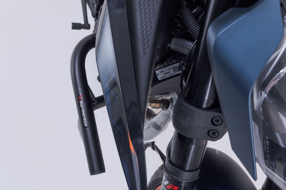 Geeignet für die KTM 125 / 390 Duke, diese Sturzbügel verfügen über eine wetter- und korrosionsbeständige Pulverbeschichtung in Schwarz. Die Oberflächenveredelung erfolgt in einer hochmodernen Anlage im SW-MOTECH Werk in Brünn in der Tschechischen Republik.