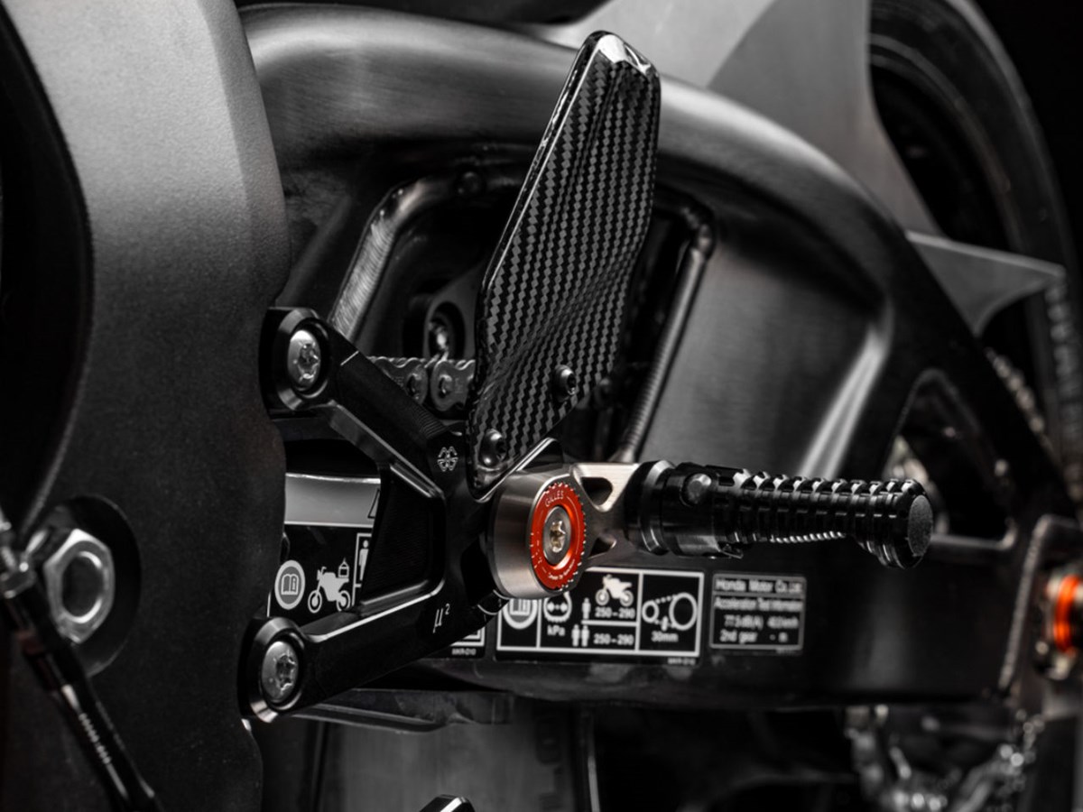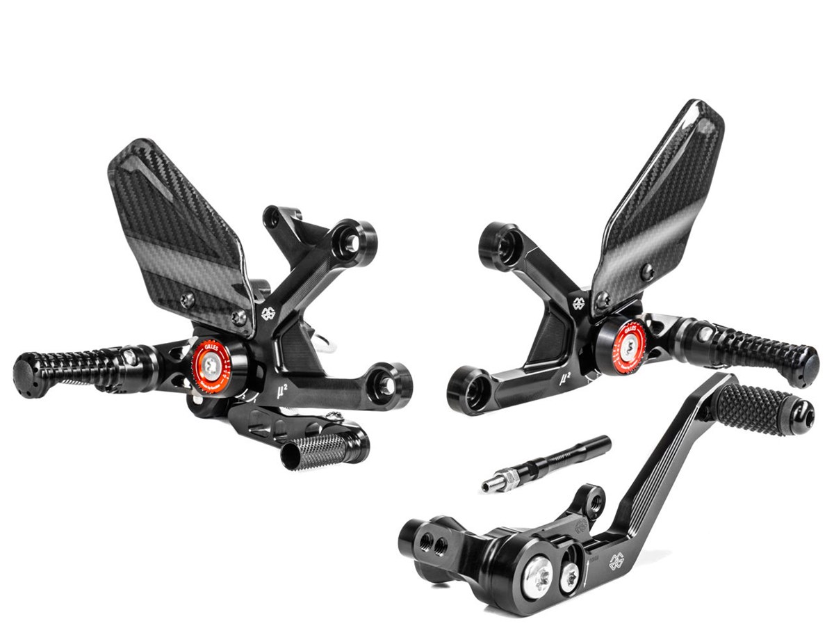 Eine völlig neue Generation von Fußrastenanlagen: die MUE2 kombiniert futuristisches Design mit allerhöchster Verarbeitungsqualität und deutlich vereinfachter Einstellbarkeit der Fußrastenposition. Schwarz eloxiert, mit farblich abgesetzten Verstellern, ist Sie auch optisch ein Highlight an jedem Bike. Die Positionen von Fußrasten sowie Brems- und Schalthebeln sind nach eigenen Wünschen frei einstellbar. Die Positionierung der Fußrasten erfolgt durch eine Kombination aus schieb- und drehbarer Einstellung an nur einem Punkt, so ist diese extrem schnell und einfach wählbar (fünf Positionen durch schieben und vier Positionen durch drehen). Der Umbau auf Umkehrschaltung erfolgt durch das einfache verdrehen des Schaltarms. Brems- und Schalthebel sind doppelt kugelgelagert für perfekt spielfreie Funktion der Hebel, über Exzenter lassen sich die Trittstücke je nach Wunsch einstellen. Carbonfersenschützer beidseitig runden den Lieferumfang ab. Diese Anlage ist mit klappbaren Rasten ausgestattet. Zusätzliche Option bei beiden Schaltschemen: Schaltgestänge kann wie Serienposition eingestellt werden oder wahlweise in der „Fast“ Position (Schaltweg wird verkürzt). Schalthebel 10 mm in der Höhe einstellbar, ohne das Justierung von Schaltstange oder Schaltautomat nötig wird.