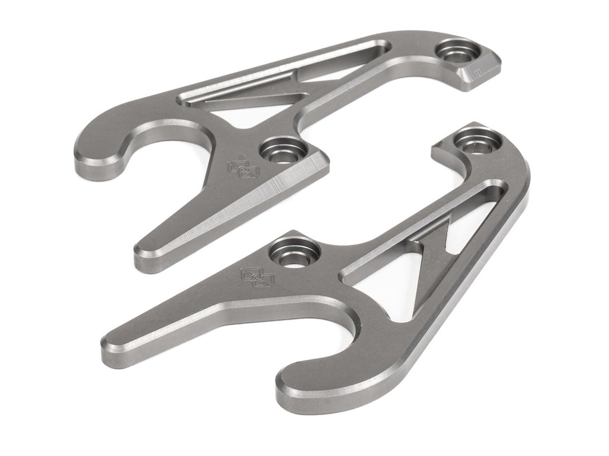 Aufbocken des Bikes im MotoGP Style. Diese Stand Hooks nutzen das vorhandene Gewinde der Schwinge und werden zusätzlich mit einer Klemmschraube fixiert. Gefertigt sind die Hooks aus schwarz eloxiertem Aluminium.