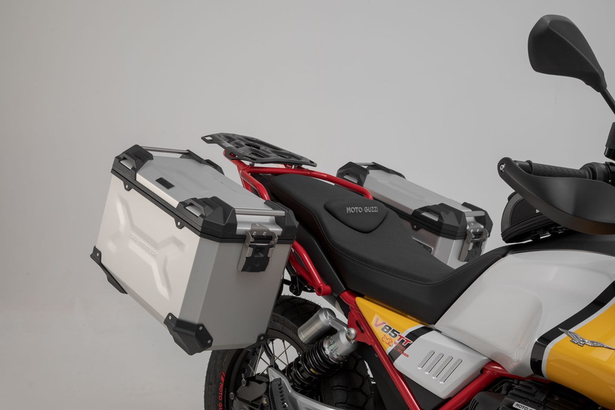 Die robusten TRAX ADV Alukoffer fühlen sich auf jeder Strecke zuhause: Designprägungen unterstützen die Stabilität des 1,5 Millimeter starken, geschweissten Aluminium-Wandmaterials. Ein komplett abnehmbarer Deckel mit Tragegriffen aus eloxiertem Aluminium und Schnellverschlüssen erleichtert Be- und Entladen der Motorradkoffer, die abgeschrägte Seitenkante gibt hohe Bodenfreiheit bei der Kurvenfahrt. Mit dieser Komplettlösung hast du alle benötigten Komponenten, um direkt mit TRAX auf grosse Reise zu gehen: Zwei wasserdichte TRAX ADV Seitenkoffer, zwei abnehmbare SW-MOTECH Seitenträger, Adapterkit, Schloss-Satz, Öffnungsbegrenzer und Diebstahlsicherung zum attraktiven Gesamtpreis. Die modellspezifischen Träger und die Grösse der Koffer sind perfekt auf Heckgeometrie und Auspuffanlage des Motorrades abgestimmt.