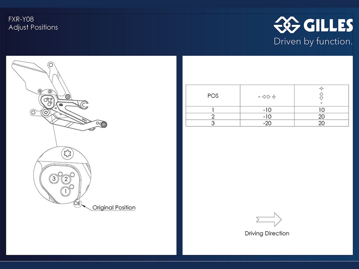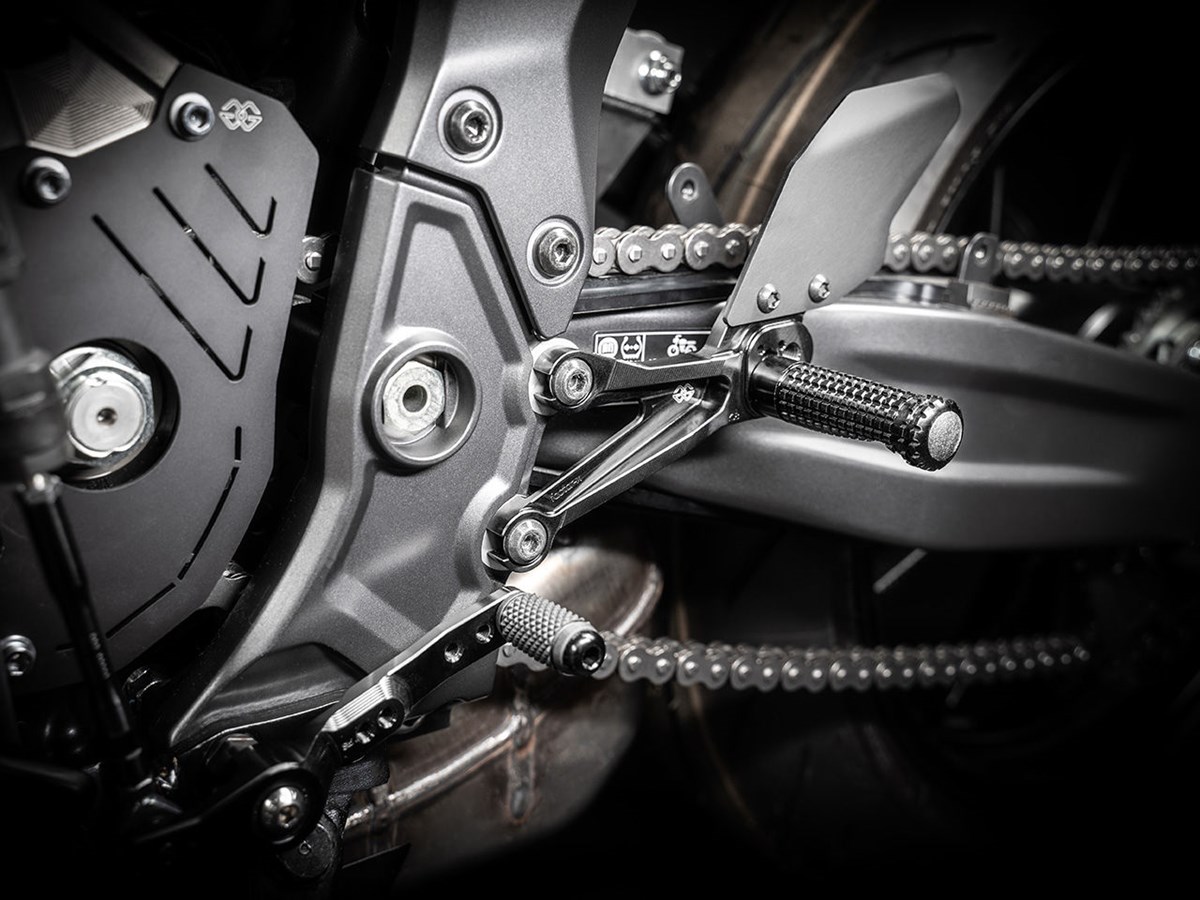 Reduziert auf maximale Performance. Know-how aus der World Superbike. Puristische Sportlichkeit in ästhetischem Design. Perfekte Balance aus Leichtbau und Verwindungssteifigkeit. Einzigartig durch geschütztes GILLES Design. Doppelt kugelgelagerte Schalt- und Bremshebel. Gummiertes Trittstück am Schalthebel für verbesserten Komfort. 3-fach einstellbare starre Racingraste UF-18. Normal- oder Umkehrschaltung möglich. Wenn das Motorrad über keinen Quickshifter verfügt, wird das Anbaukit ABK-FXR-Y08-B benötgti, siehe Zubehörartikel.