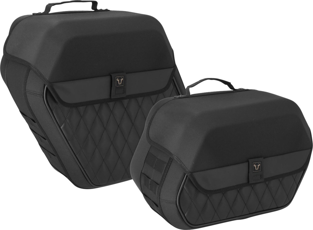Die geräumige Seitentasche ist komplett in Schwarz gehalten. Das Aussenmaterial ist eine Kombination aus Textilgewebe und genarbtem Kunstleder mit aufwendiger Rautensteppung. Für eine Extraportion Komfort verfügt die Seitentasche über einen integrierten Tragegriff. Die Tasche hat zusätzlich ein MOLLE-System zur Befestigung von Zusatztaschen. Langfinger und Regen haben keine Chance: Die integrierte Diebstahlsicherung, der abschliessbare Deckel und die mitgelieferte, wasserdichte Innentasche schützen dein Gepäck.