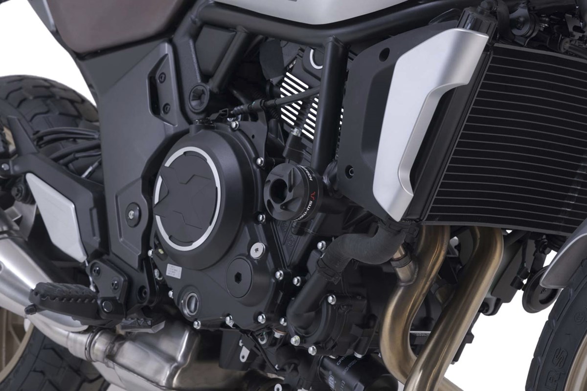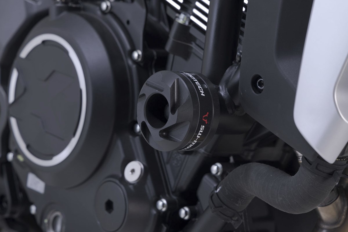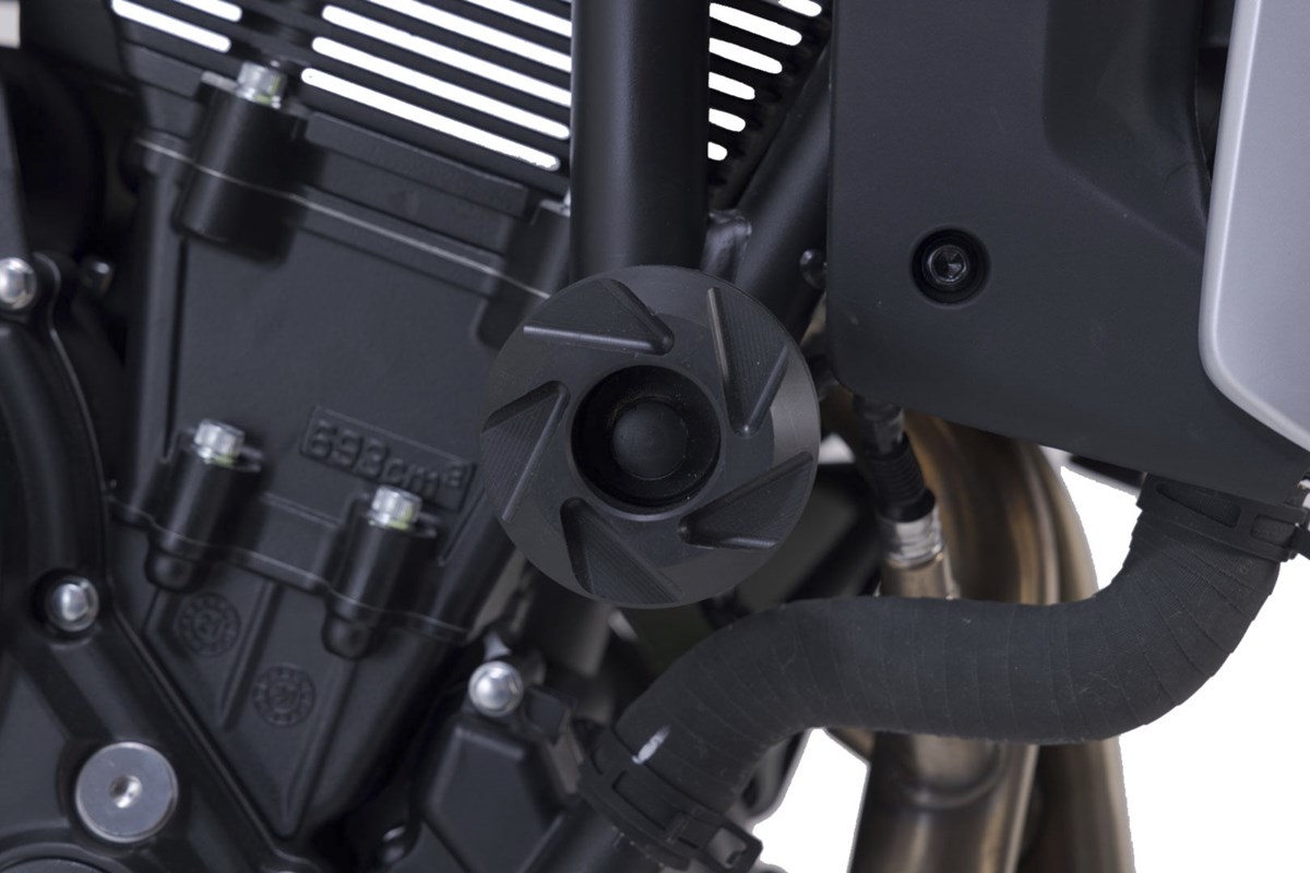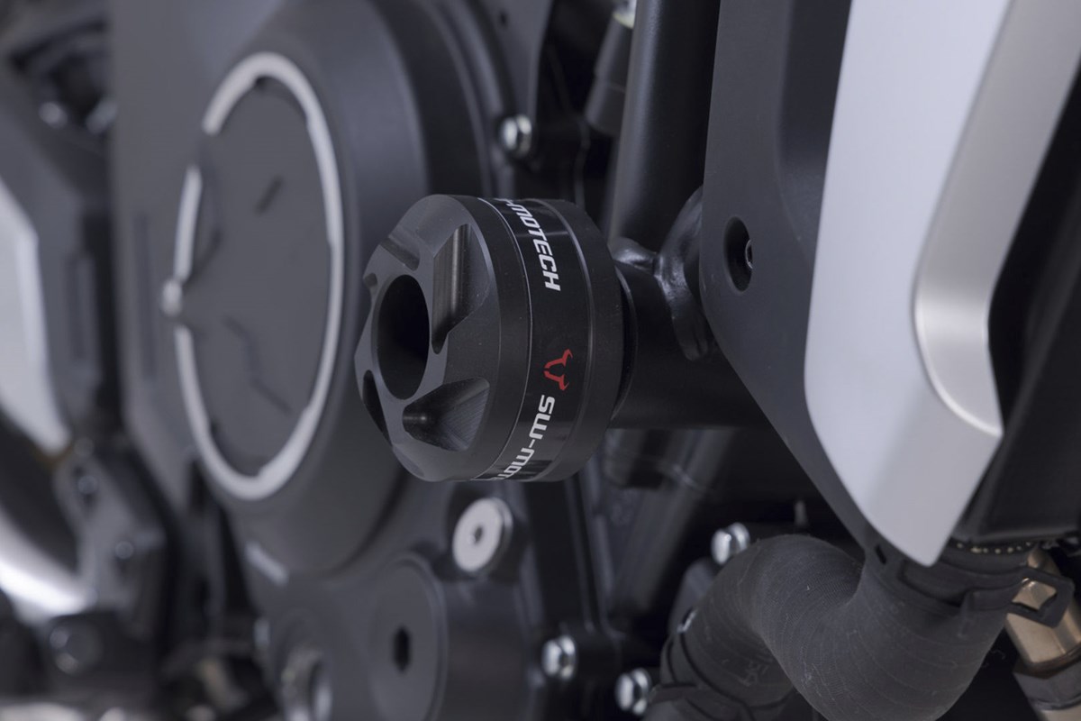 Zusätzlichen Schutz im Falle eines Sturzes geben Rahmen-Sturzpads. Form, Oberfläche und Material sorgen für hervorragende Gleiteigenschaften und verringern Schäden am Motorrad. Die robuste Alu-Unterkonstruktion lässt sich leicht montieren und bei Bedarf lassen sich die CNC-gefrästen Schleifpads aus abriebfestem Polyamid schnell austauschen.