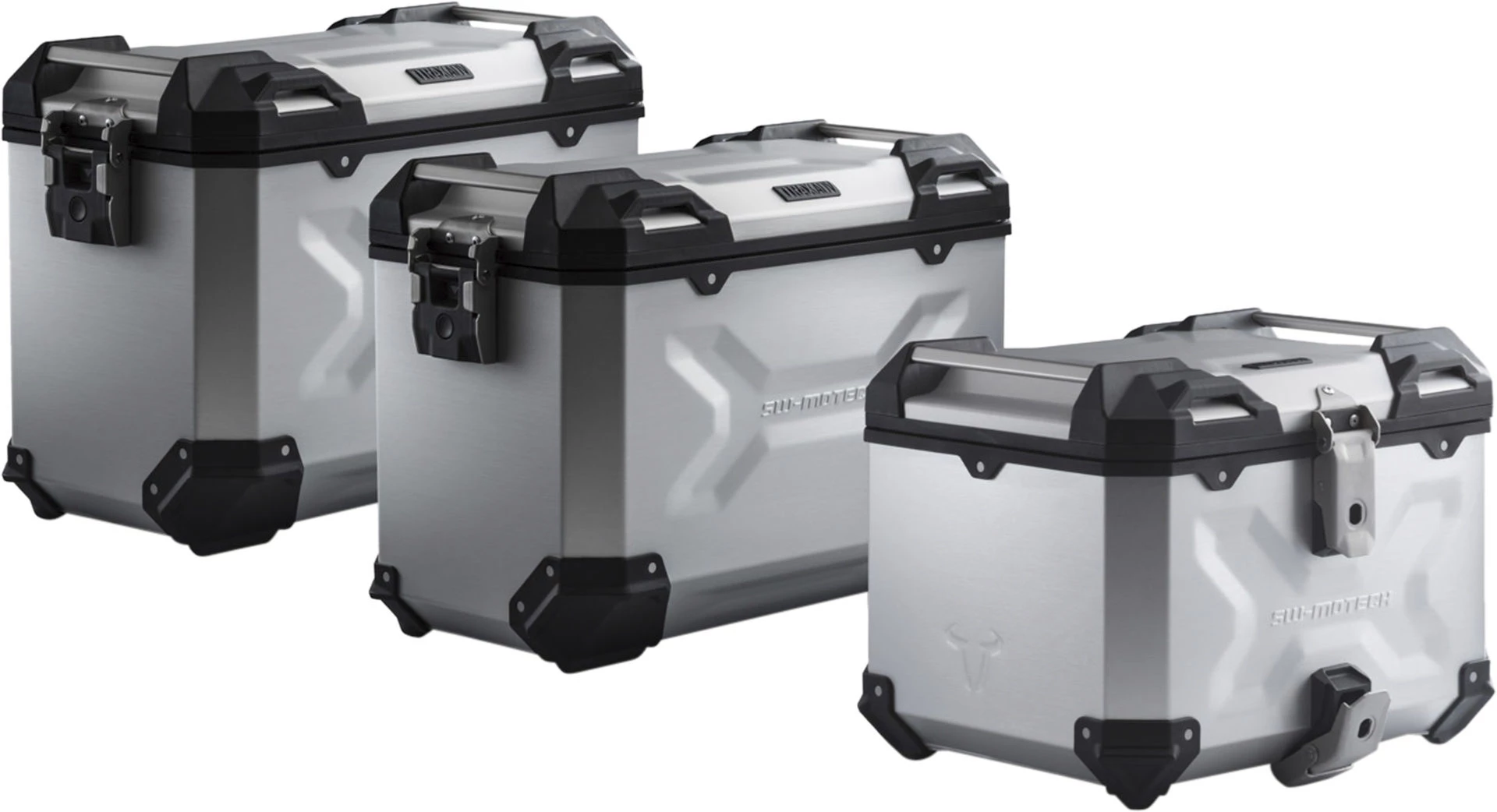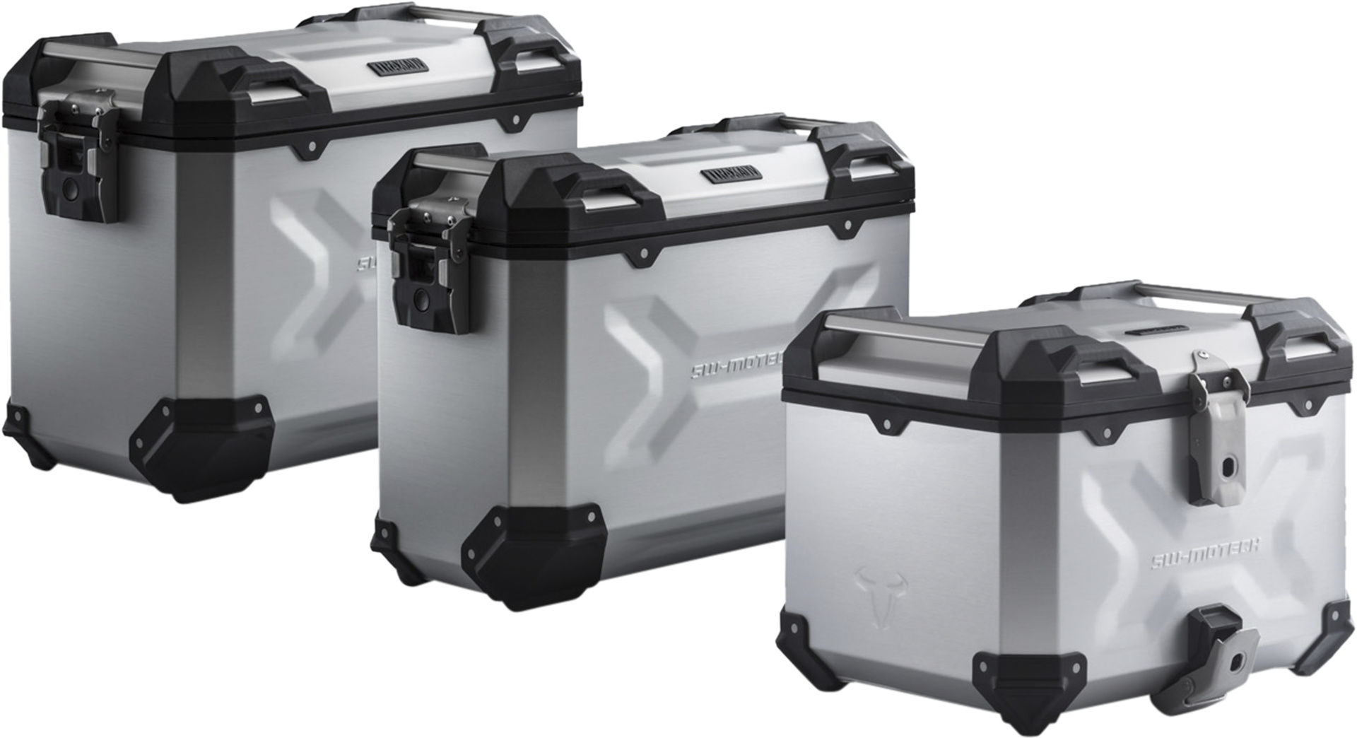 Dieses Set ist das Rund-um-Sorglos-Paket für jede Tour. Die wasser- und staubdichten TRAX ADV Premium-Alukoffer, zwei Seitenkoffer und ein Topcase, bieten deinem Gepäck besten Schutz. Die modellspezifische Entwicklung des abnehmbaren PRO Seitenträgers und des ADVENTURE-RACK Gepäckträgers garantieren beste Passform und den sicheren Halt der Alukoffer.