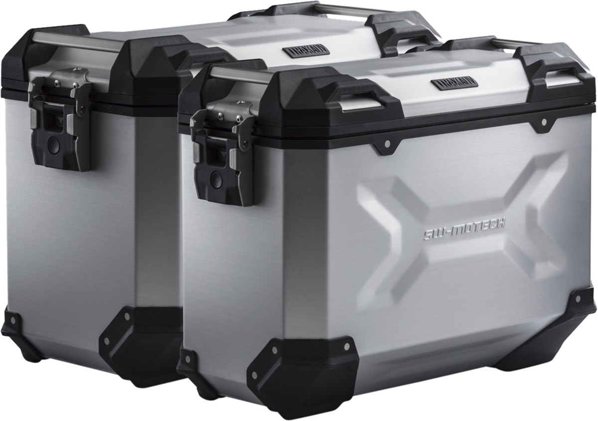 Die robusten TRAX ADV Alukoffer fühlen sich auf jeder Strecke zuhause: Designprägungen unterstützen die Stabilität des 1,5 Millimeter starken, geschweissten Aluminium-Wandmaterials. Ein komplett abnehmbarer Deckel mit Tragegriffen aus eloxiertem Aluminium und Schnellverschlüssen erleichtert Be- und Entladen der Motorradkoffer, die abgeschrägte Seitenkante gibt hohe Bodenfreiheit bei der Kurvenfahrt. Mit dieser Komplettlösung hast du alle benötigten Komponenten, um direkt mit TRAX auf grosse Reise zu gehen: Zwei wasserdichte TRAX ADV Seitenkoffer, zwei abnehmbare SW-MOTECH Seitenträger, Adapterkit, Schloss-Satz, öffnungsbegrenzer und Diebstahlsicherung zum attraktiven Gesamtpreis. Die modellspezifischen Träger und die Grösse der Koffer sind perfekt auf Heckgeometrie und Auspuffanlage des Motorrades abgestimmt.