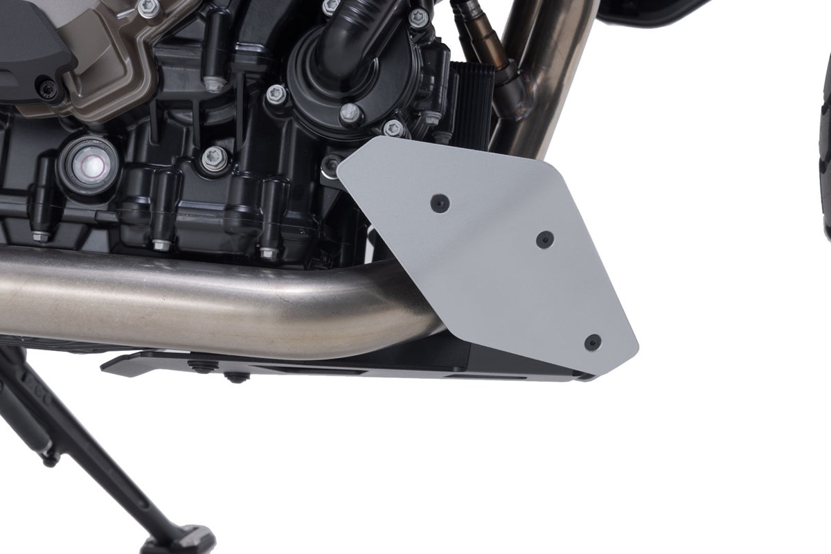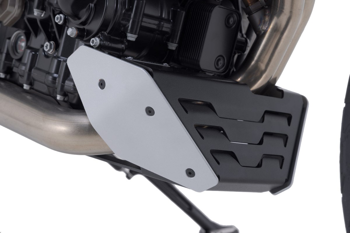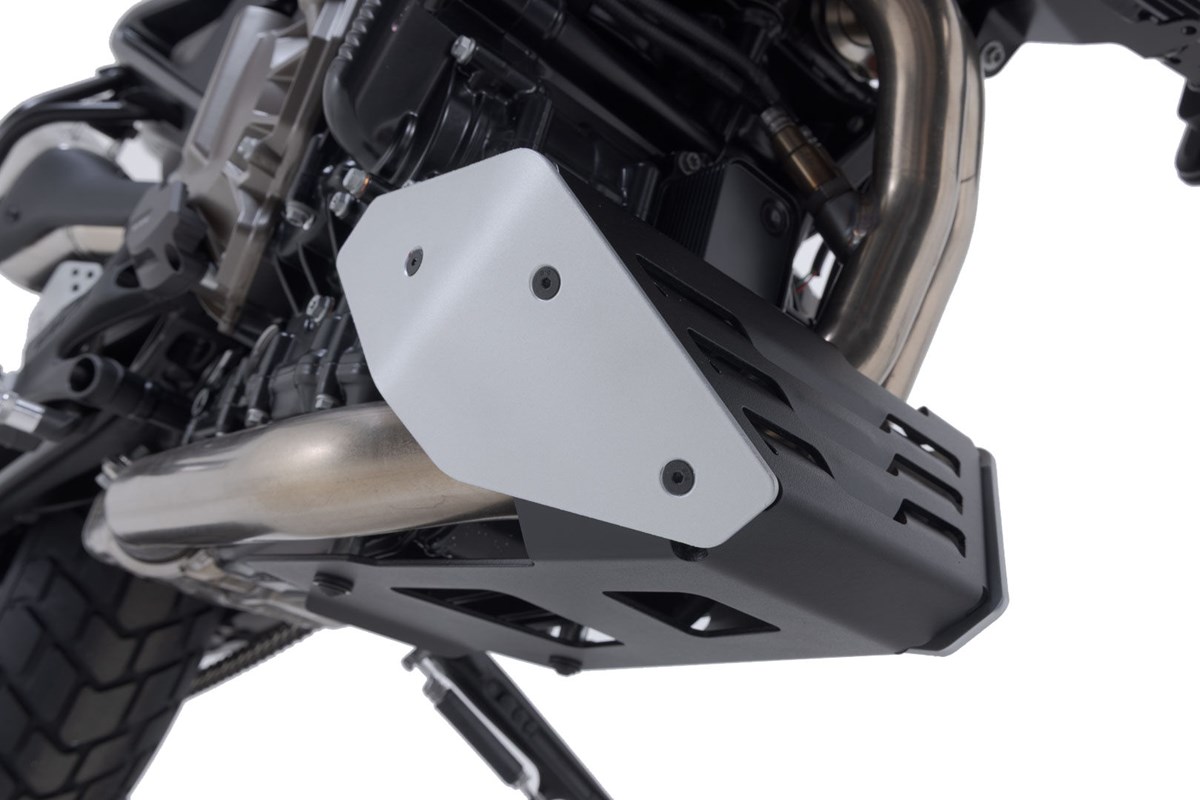 Der auf das Design des Bikes abgestimmte Bugspoiler von SW-MOTECH bietet zuverlässigen Schutz vor Steinschlag und bei ungewolltem Bodenkontakt. Die Pulverschichtung der Oberfläche ist äusserst strapazierfähig und schützt dauerhaft vor Korrosion. Der äusserst stabile Unterbodenschutz lässt sich mittels mitgelieferter, massgeschneiderter Anbauelemente aus Stahl problemlos ohne Bohren und Schweissen an Original-Befestigungspunkten anbringen.