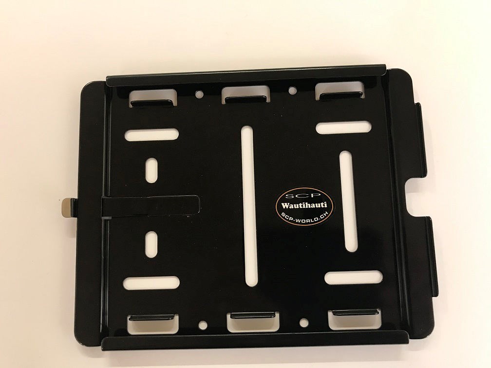 Nummernschild-Halterahmen aus Edelstahl, passt durch die ausgeklügelte Lochstruktur an fast alle Motorräder. Das Nummernschild kann von links oder rechts in den Rahmen geschoben werden und wird durch eine Blattfeder fixiert.
