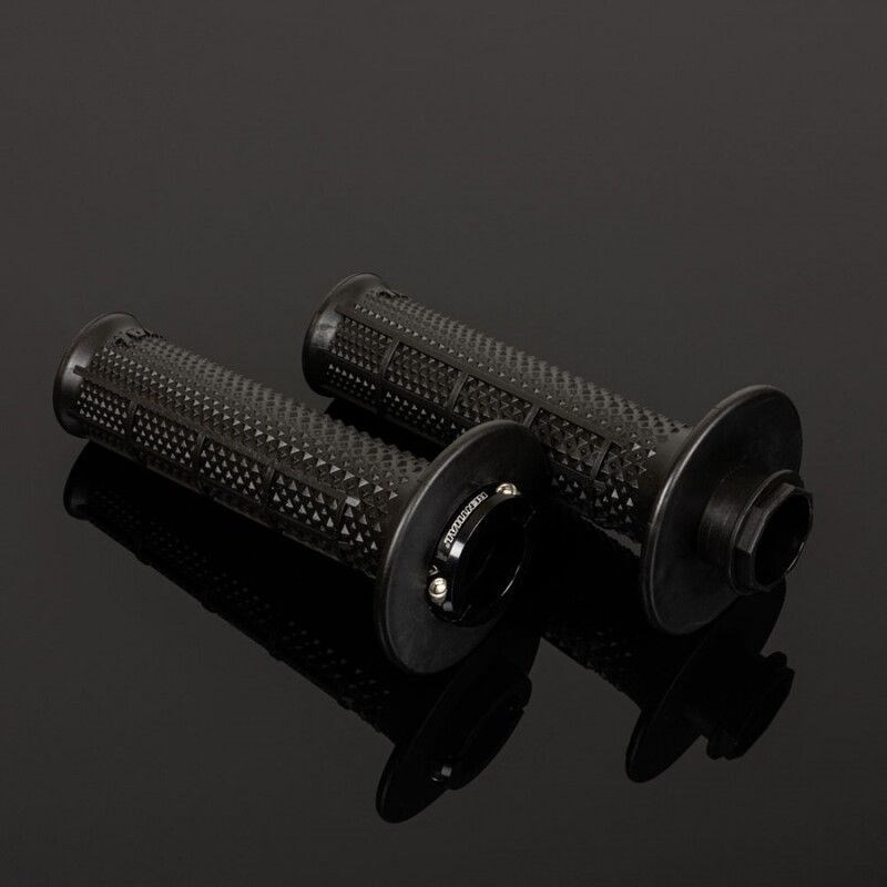 Die Renthal Tapered MX Lock-On Griffe verfügen über ein einzigartiges, verjüngtes Muster. Entworfen, um die Form einer geschlossenen Faust nachzuahmen, verjüngen sich übergroße Diamanten zu einer regulären Diamantgröße, um die Traktion zwischen Fahrer und Maschine zu verbessern.